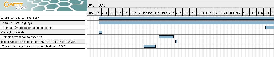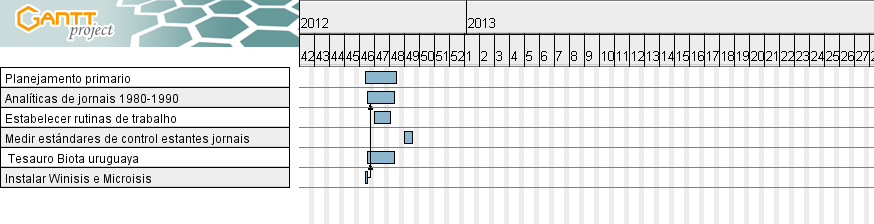 Foram somente dois meses. Planejou-se aproximadamente o que seria feito no futuro. O software que é normalmente se emprega em qualquer biblioteca (Winisis) foi instalado. As rotinas de trabalho foram escritas, se viu qual foi o trabalho realizado, catálogos e manuais, e quais estavao já informatizados. Foram estabelecidos padrões para cotejar a coleção de jornais (103 mil jornais para ingresar de cardoes já existentes e após disso pesquisar pelas cópias faltantes), dos quais 550 títulos foram ingresados pela biblioteconomista Gallarreta e pela Senhora Sexenián. Começou-se entrar analíticas todos os dias, apos de fazer uma amostra de 100 analítica aleatoriamente, e se obteve que tinham-se o 75% dos jornais e nao estao o 25 % dos jornais. Determinou-se um estandard de ingreso de 40 cardoes cada dia. Começou-se a fazer um thesauro da biota uruguaia para tematizar as analíticas e os livros no futuro. Se fez um relatório final desse breve período de tempo no ano 2012, após do qual o trabalho foi planejado para executar em 2013 foi apresentado.