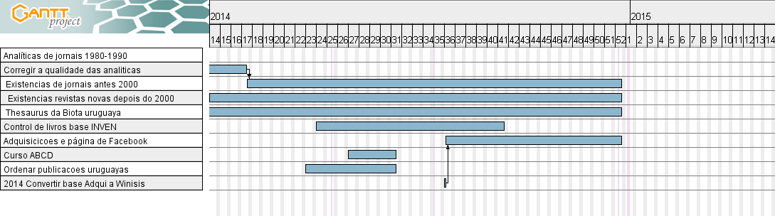 Em 2014 a obra prevista para ser concluída consistiu em: 1) culminar com as analíticas de jornais (se fizeram 8718 analíticas), 2) realizar um gráfico de Gantt para os cinco anos 2013-2017, 3) uma vez que se terminhou o controle da qualidade da base de analíticas de jornais, 4) começaram-se a entrar stocks diários de cardex de jornais anteriores ao ano 2000 (53 registros por dia), 6) se entraram novos jornais e títulos de revistas na base de dados Access que chegam periódicamente (234 títulos diferentes), 7) continuou-se o thesaurus uruguaio da biota, 8) começou-se o controle dos livros entrados pela biblioteconomista Gallareta